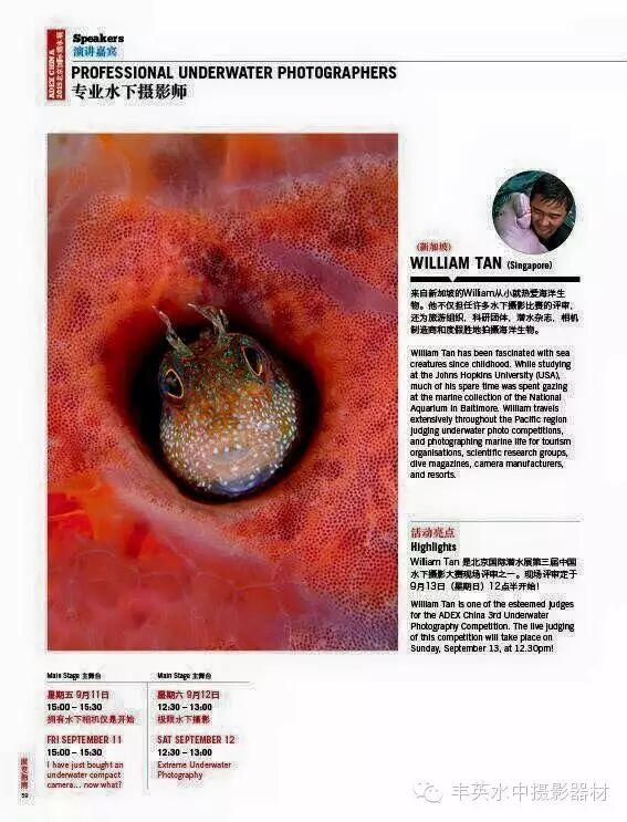 台灣水攝界的朋友一定知道 William Tan 大師,這位在國際叱吒風雲的低調水下攝影師,曾經來台北舉辦講座,現場高朋滿座。今年特別受豐英水中攝影的邀請,將在北京舉辦他的作品及拍攝技巧分享會,對於想要更上一層樓的水攝朋友們來說,真是難得的機會。